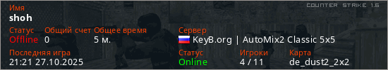 Играет на Counter Strike 1.6 сервере. Страна: РоссияПервый раз замечен 20:53 27.10.2025