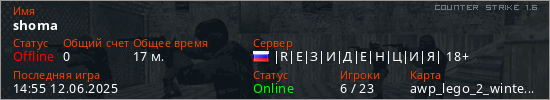 Играет на Counter Strike 1.6 сервере. Страна: РоссияПервый раз замечен 18:12 10.06.2025