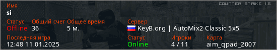 Играет на Counter Strike 1.6 сервере. Страна: РоссияПервый раз замечен 12:40 11.01.2025