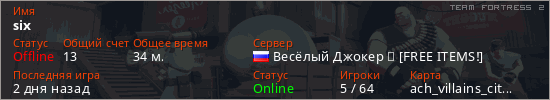 Играет на Team Fortress 2 сервере. Страна: РоссияПервый раз замечен 18:55 05.04.2026