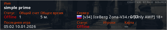 Играет на Counter Strike Source сервере. Страна: РоссияПервый раз замечен 04:58 10.01.2026