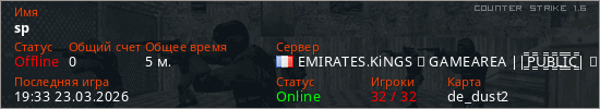 Последний раз был в сети 19:33 23.03.2026 Игрок с таким ником замечен на 23 серверах