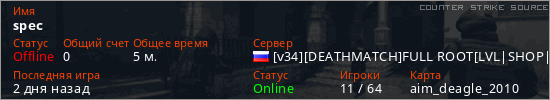Играет на Counter Strike Source сервере. Страна: РоссияПервый раз замечен 16:26 22.12.2025