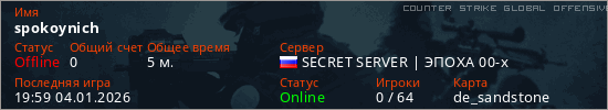 Играет на Counter Strike Global Offensive сервере. Страна: РоссияПервый раз замечен 19:48 04.01.2026