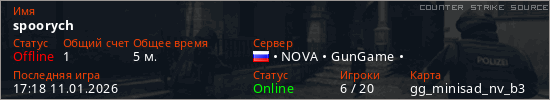Играет на Counter Strike Source сервере. Страна: РоссияПервый раз замечен 17:14 11.01.2026