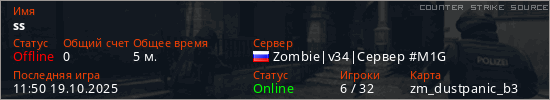 Играет на Counter Strike Source сервере. Страна: РоссияПервый раз замечен 10:58 19.10.2025