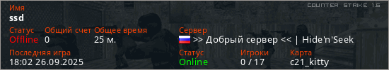 Играет на Counter Strike 1.6 сервере. Страна: РоссияПервый раз замечен 19:43 21.08.2025