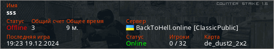 Играет на Counter Strike 1.6 сервере. Страна: УкраинаПервый раз замечен 19:06 19.12.2024