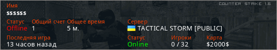 Играет на Counter Strike 1.6 сервере. Страна: УкраинаПервый раз замечен 19:40 16.02.2026