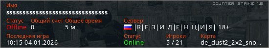 Играет на Counter Strike 1.6 сервере. Страна: РоссияПервый раз замечен 10:13 04.01.2026