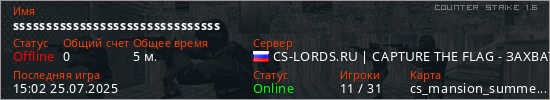 Играет на Counter Strike 1.6 сервере. Страна: РоссияПервый раз замечен 15:00 25.07.2025