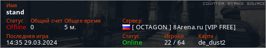 Играет на Counter Strike Source сервере. Страна: РоссияПервый раз замечен 14:19 29.03.2024