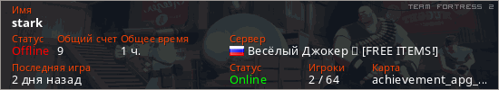 Играет на Team Fortress 2 сервере. Страна: РоссияПервый раз замечен 17:10 11.03.2026