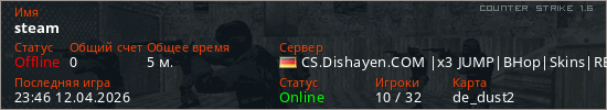 Играет на Counter Strike 1.6 сервере. Страна: ГерманияПервый раз замечен 23:42 12.04.2026
