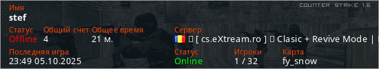 Играет на Counter Strike 1.6 сервере. Страна: РумынияПервый раз замечен 03:00 25.02.2025
