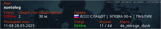 Играет на Counter Strike Global Offensive сервере. Страна: РоссияПервый раз замечен 15:07 06.05.2025