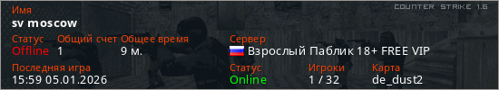 Играет на Counter Strike 1.6 сервере. Страна: РоссияПервый раз замечен 14:46 05.01.2026
