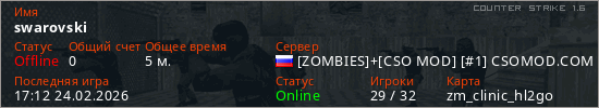 Играет на Counter Strike 1.6 сервере. Страна: РоссияПервый раз замечен 16:57 24.02.2026