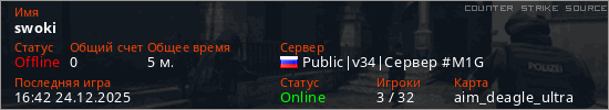 Играет на Counter Strike Source сервере. Страна: РоссияПервый раз замечен 16:33 24.12.2025