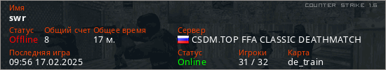 Играет на Counter Strike 1.6 сервере. Страна: РоссияПервый раз замечен 09:27 07.02.2025