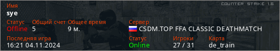 Играет на Counter Strike 1.6 сервере. Страна: РоссияПервый раз замечен 15:48 04.11.2024