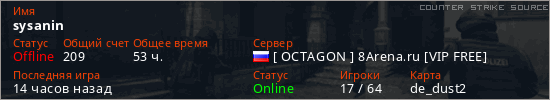 Играет на Counter Strike Source сервере. Страна: РоссияПервый раз замечен 12:56 29.12.2022
