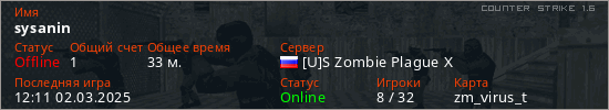 Играет на Counter Strike 1.6 сервере. Страна: РоссияПервый раз замечен 13:43 15.12.2024