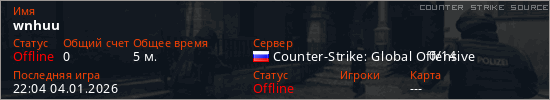 Играет на Counter Strike Source сервере. Страна: РоссияПервый раз замечен 21:19 04.01.2026