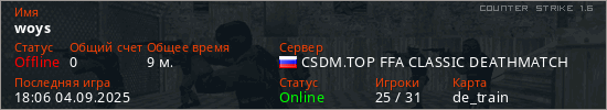 Играет на Counter Strike 1.6 сервере. Страна: РоссияПервый раз замечен 16:52 04.09.2025