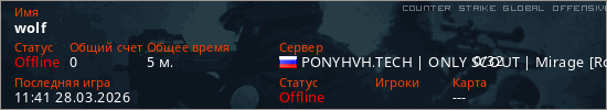 Играет на Counter Strike Global Offensive сервере. Страна: РоссияПервый раз замечен 11:39 28.03.2026