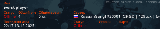 Играет на Counter Strike Global Offensive сервере. Страна: РоссияПервый раз замечен 22:15 13.12.2025