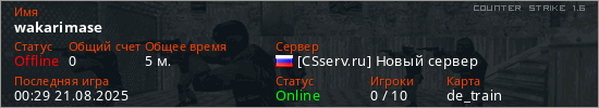 Играет на Counter Strike 1.6 сервере. Страна: РоссияПервый раз замечен 00:19 21.08.2025
