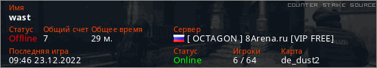 Играет на Counter Strike Source сервере. Страна: РоссияПервый раз замечен 09:20 23.12.2022