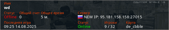 Играет на Counter Strike 1.6 сервере. Страна: РоссияПервый раз замечен 08:39 14.08.2025