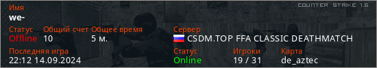 Играет на Counter Strike 1.6 сервере. Страна: РоссияПервый раз замечен 22:06 14.09.2024