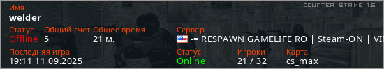 Играет на Counter Strike 1.6 сервере. Страна: СШАПервый раз замечен 23:28 23.08.2025
