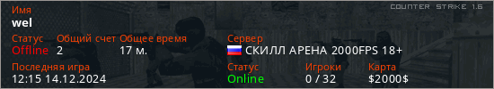 Играет на Counter Strike 1.6 сервере. Страна: РоссияПервый раз замечен 09:15 18.09.2023