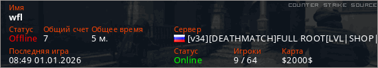 Играет на Counter Strike Source сервере. Страна: РоссияПервый раз замечен 08:45 01.01.2026