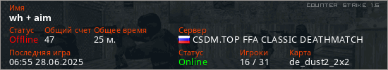 Играет на Counter Strike 1.6 сервере. Страна: РоссияПервый раз замечен 07:52 02.05.2025