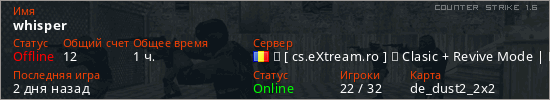 Играет на Counter Strike 1.6 сервере. Страна: РумынияПервый раз замечен 12:29 16.05.2025