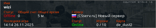 Играет на Counter Strike 1.6 сервере. Страна: РоссияПервый раз замечен 13:43 26.11.2025