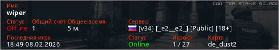 Играет на Counter Strike Source сервере. Страна: РоссияПервый раз замечен 18:39 08.02.2026