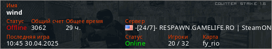 Играет на Counter Strike 1.6 сервере. Страна: СШАПервый раз замечен 03:29 29.01.2025