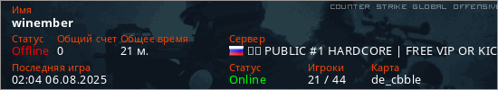 Играет на Counter Strike Global Offensive сервере. Страна: РоссияПервый раз замечен 00:53 06.08.2025