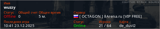 Играет на Counter Strike Source сервере. Страна: РоссияПервый раз замечен 10:39 23.12.2025