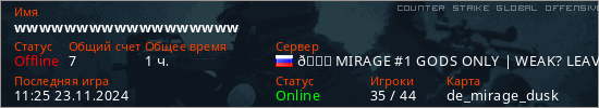 Играет на Counter Strike Global Offensive сервере. Страна: РоссияПервый раз замечен 16:51 20.07.2024