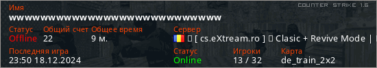 Играет на Counter Strike 1.6 сервере. Страна: РумынияПервый раз замечен 23:36 18.12.2024