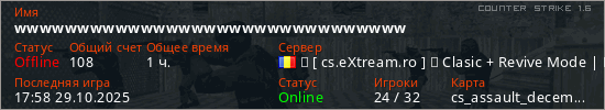 Играет на Counter Strike 1.6 сервере. Страна: РумынияПервый раз замечен 11:43 19.12.2024