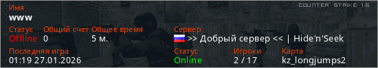 Играет на Counter Strike 1.6 сервере. Страна: РоссияПервый раз замечен 01:04 27.01.2026