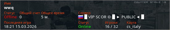 Играет на Counter Strike 1.6 сервере. Страна: РоссияПервый раз замечен 18:16 15.03.2026